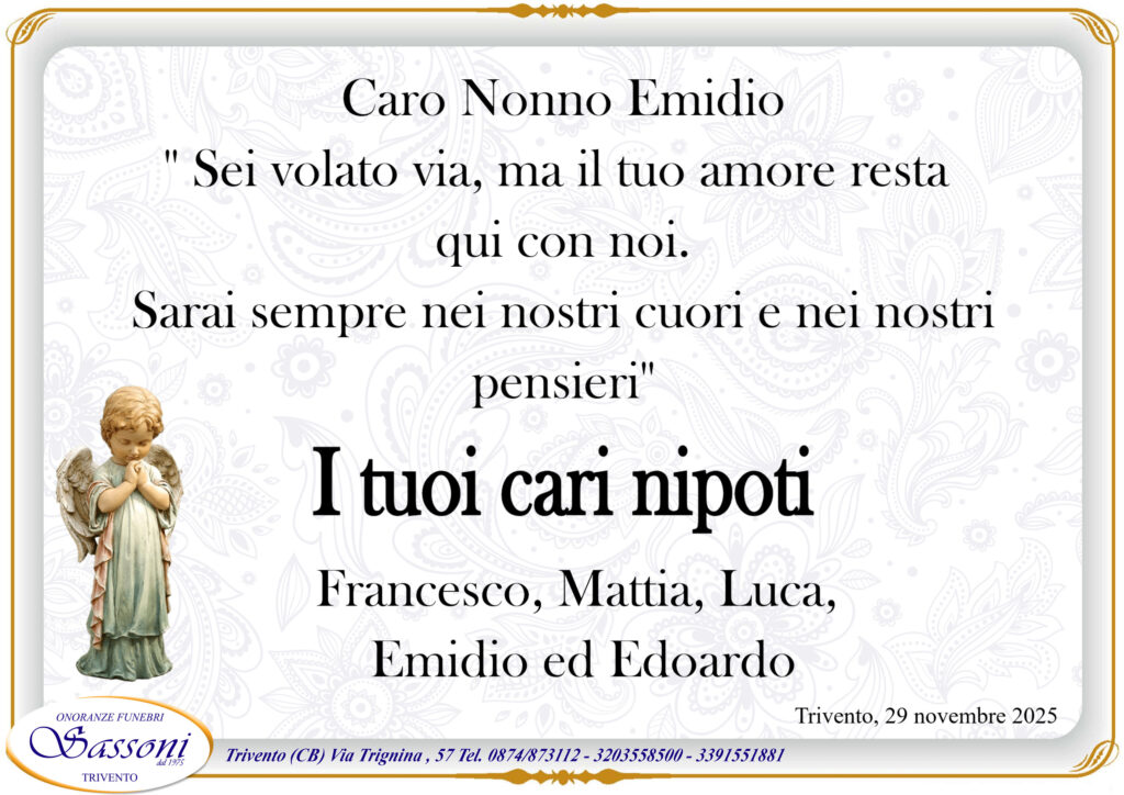 Riposa in pace Emidio. Sentite condoglianze a tutta la famiglia da Gaetano Griguoli e Carmelina Fierro.